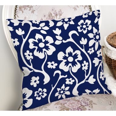 Lacivert Zeminli Beyaz Tropik Yaprak Motifli Yastık Kırlent Kılıfı