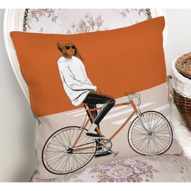 Koyu Turuncu Krem Zemin Bisikletli Adam Motifli Yastık Kırlent Kılıfı