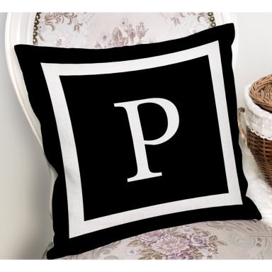 Siyah Zemin Beyaz Çerçeveli P Harfi Dijital Baskılı Kırlent Kılıfı