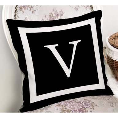 Siyah Zemin Beyaz Çerçeveli V Harfi Dijital Baskılı Kırlent Kılıfı
