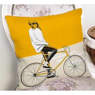 Sarı Krem Zemin Bisikletli Adam Motifli Yastık Kırlent Kılıfı