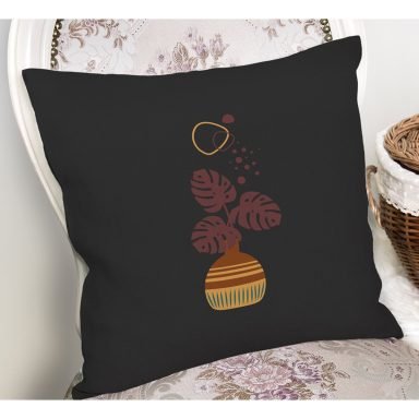 Siyah Zeminli Vazoda Tropik Yaprak Motifli Dekoratif Yastık Kırlent Kılıfı