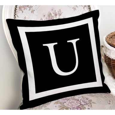 Siyah Zemin Beyaz Çerçeveli U Harfi Dijital Baskılı Kırlent Kılıfı