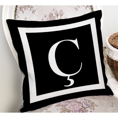 Siyah Zemin Beyaz Çerçeveli Ç Harfi Dijital Baskılı Kırlent Kılıfı