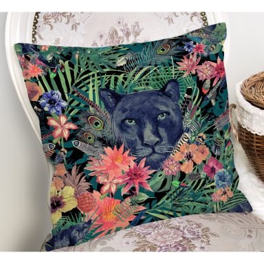 Siyah Zeminde Leopar ve Çiçekler Özel Tasarım Yastık Kırlent Kılıfı