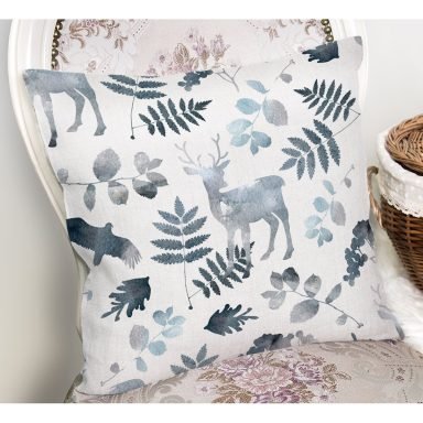 Lacivert Zeminde Geyik ve Yaprak Motifleri Dijital Baskılı Kırlent Kılıfı
