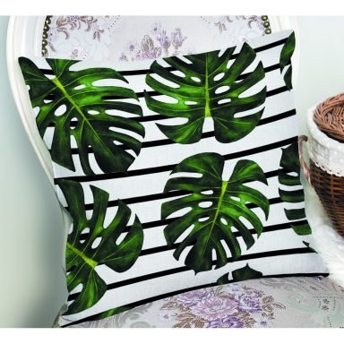 Siyah Yatay Çizgiler Üzerinde Yapraklar Desenli Dijital Baskılı Dekoratif Yastık Kırlent Kılıfı