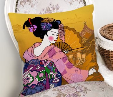 Çiçek Desenli Yelpazeli Japon Kız Motifli Modern Kırlent Kılıfı