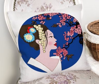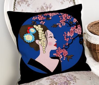 Çiçek Motifleri Üzerinde Japon Kız Desenli Modern Yastık Kılıfı
