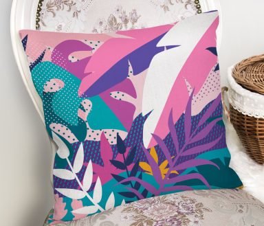 Pembe Zeminde Canlı Tropik Yaprakları Dijital Baskılı Kırlent Kılıfı
