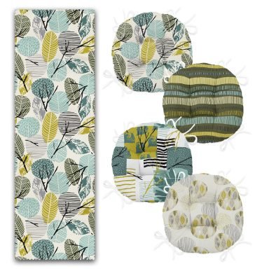 Tropik Yaprak Motifli 4 Yuvarlak Pofidik Sandalye Minderi ve 1 Runner Seti