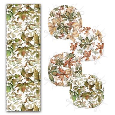 Tropik Sonbahar Yaprak Tasarımlı 4 Yuvarlak Pofidik Sandalye Minderi ve 1 Runner Seti
