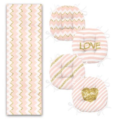 Pembe Zigzag Gold Detaylı Özel Tasarım 4 Yuvarlak Pofidik Sandalye Minderi ve 1 Runner Seti