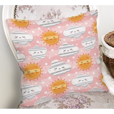 Pembe Zeminde Güneş Ve Bulut Motifli Dijital Baskılı Özel Tasarım Modern Yastık Kırlent Kılıfı