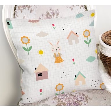 Sevimli Tavşan Ve Çiçek Motifli Dijital Baskılı Özel Tasarım Modern Yastık Kırlent Kılıfı