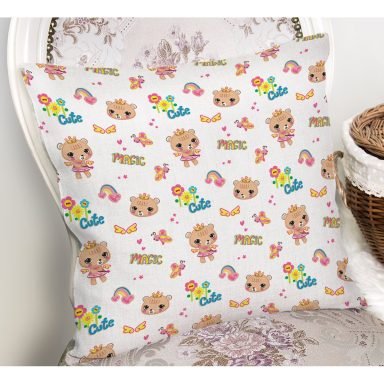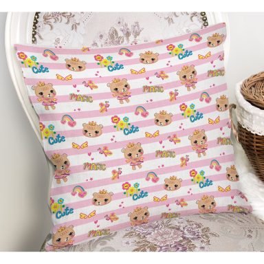Pembe Çizgili Zeminde Şirin Ayıcık Temalı Dijital Baskılı Özel Tasarım Modern Yastık Kırlent Kılıfı