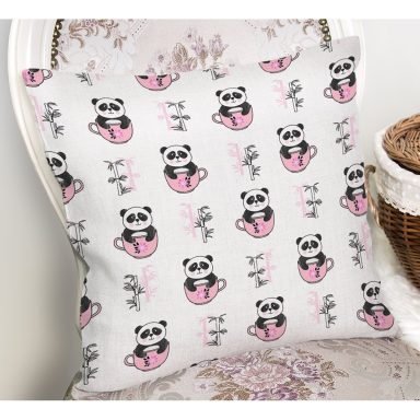 Pembe Bardak İçinde Panda Motifli Dijital Baskılı Özel Tasarım Modern Yastık Kırlent Kılıfı