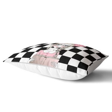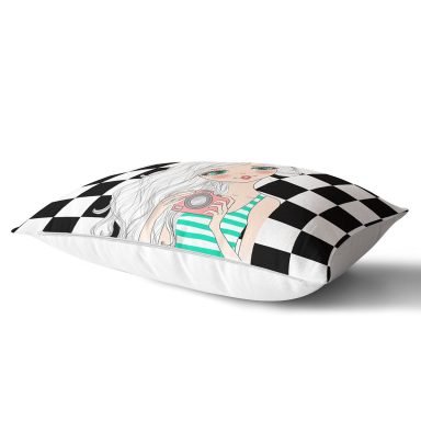 Dama Zeminli Fotoğraf Çeken Kız Tasarımlı Dijital Baskılı Modern Dikdörtgen Kırlent Kılıfı