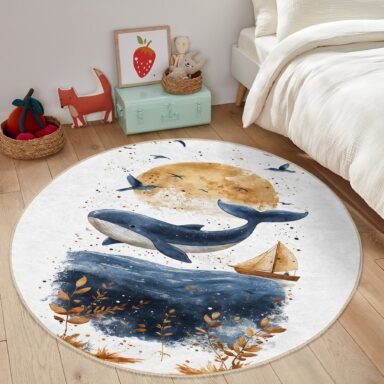 Mavi Balina ve Güneşli Deniz Manzaralı Yuvarlak Bebek Odası Halısı