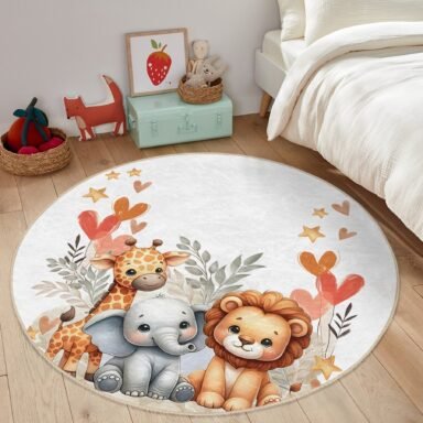 Orman Hayvanları Desenli Nordic Stil Yuvarlak Çocuk Odası Halısı