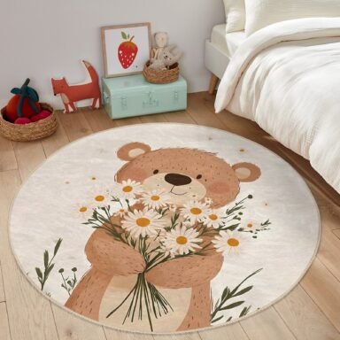 Papatya Tutan Sevimli Ayı İllüstrasyon Temalı Yuvarlak Bebek Odası Halısı