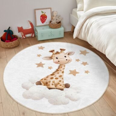 Bulutlar Üzerinde Zürafa ve Yıldızlar Pastel Tema Yuvarlak Bebek Odası Halısı