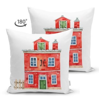 Minyatür Yeşil Ev Çizimli Dijital Baskılı Modern Süet Yastık Kırlent Kılıfı