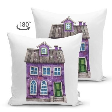 Minyatür Mor Ev Çizimli Dijital Baskılı Modern Süet Yastık Kırlent Kılıfı