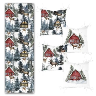 Kış Temalı Geyik Detaylı Bağ Evi Konseptli 4 Pofidik Sandalye Minderi ve 1 Runner Seti