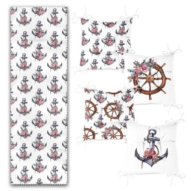 Gül Detaylı Çapa & Dümen Tasarımlı Denizci Motifli 4 Pofidik Sandalye Minderi ve 1 Runner Seti