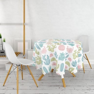 Beyaz Zeminli Renkli Kaktüs Desenli Dijital Baskılı Modern Yuvarlak Masa Örtüsü – Çap 140cm