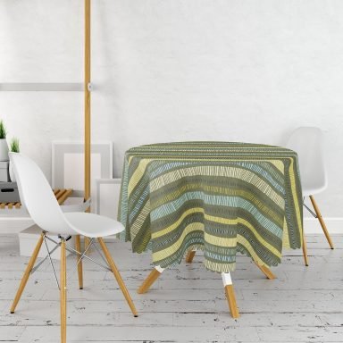 Hardal Zeminli Renkli Çizgi Desenli Dijital Baskılı Modern Yuvarlak Masa Örtüsü – Çap 140cm