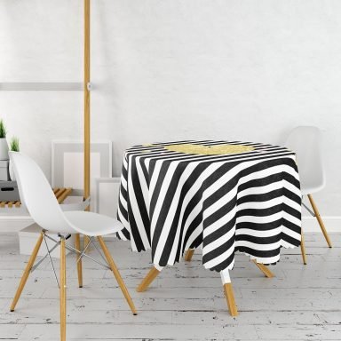 Beyaz Zemin Üzerinde Siyah Çizgili Gold Detaylı Puantiyeli Yuvarlak Masa Örtüsü – Çap 140cm