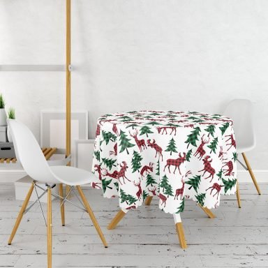 Beyaz Zemin Üzerinde Çam Ağaçli Ekoseli Geyik Motifli Yuvarlak Masa Örtüsü – Çap 140cm
