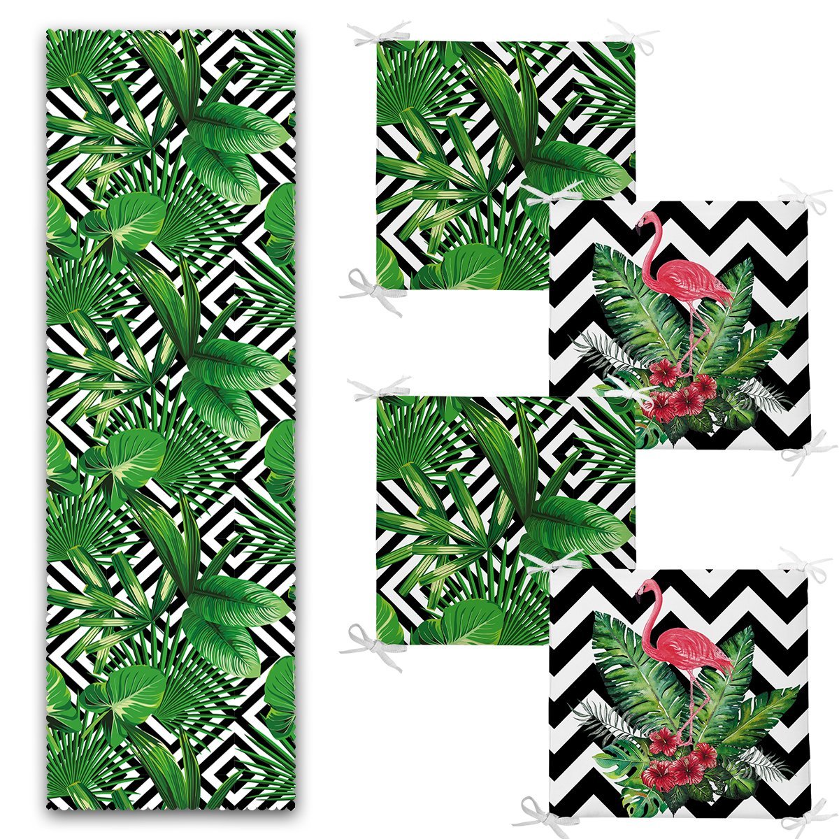 3D Yaprak ve Flamingo Tasarımlı 4 Fermuarlı Sandalye Minderi ve 1 Runner Seti