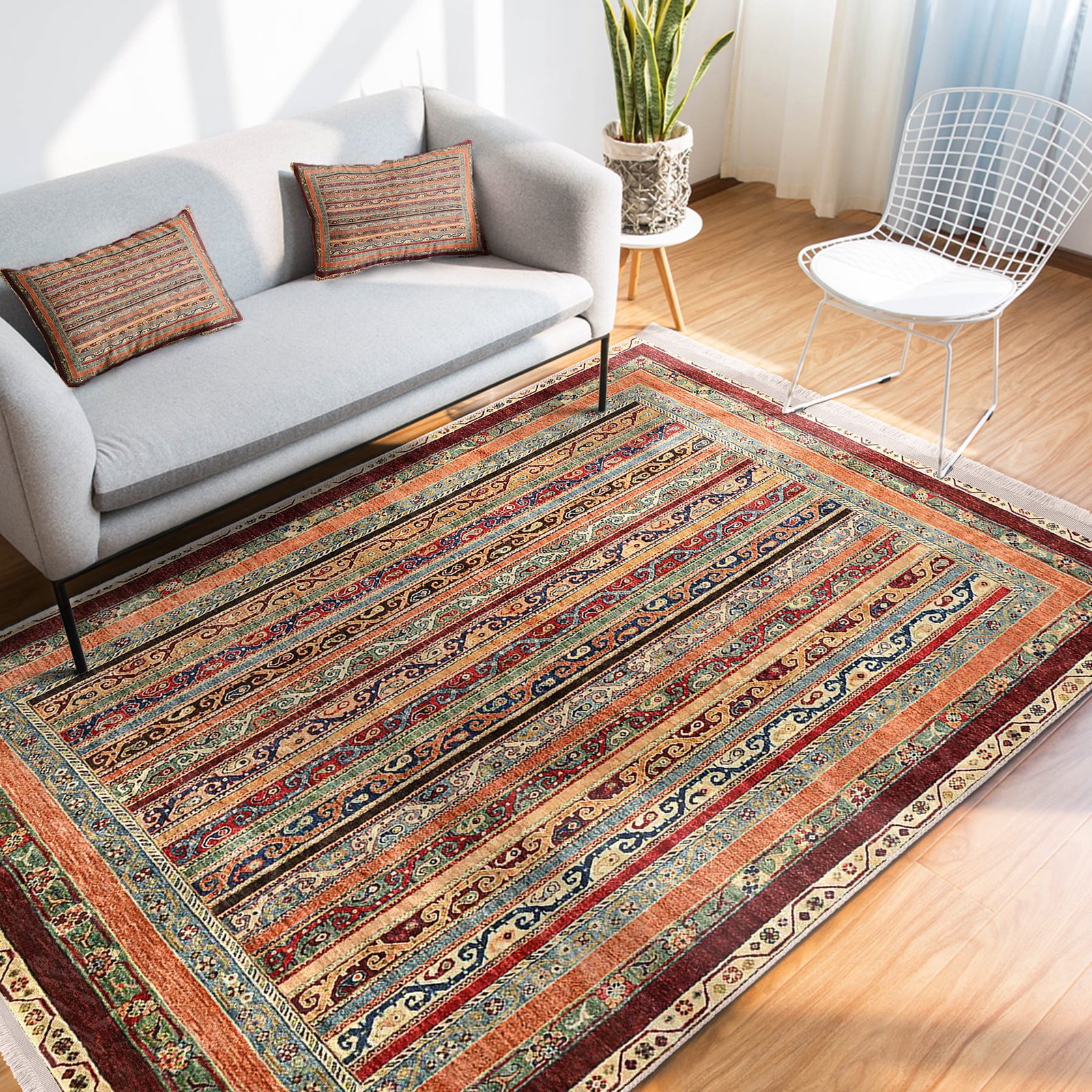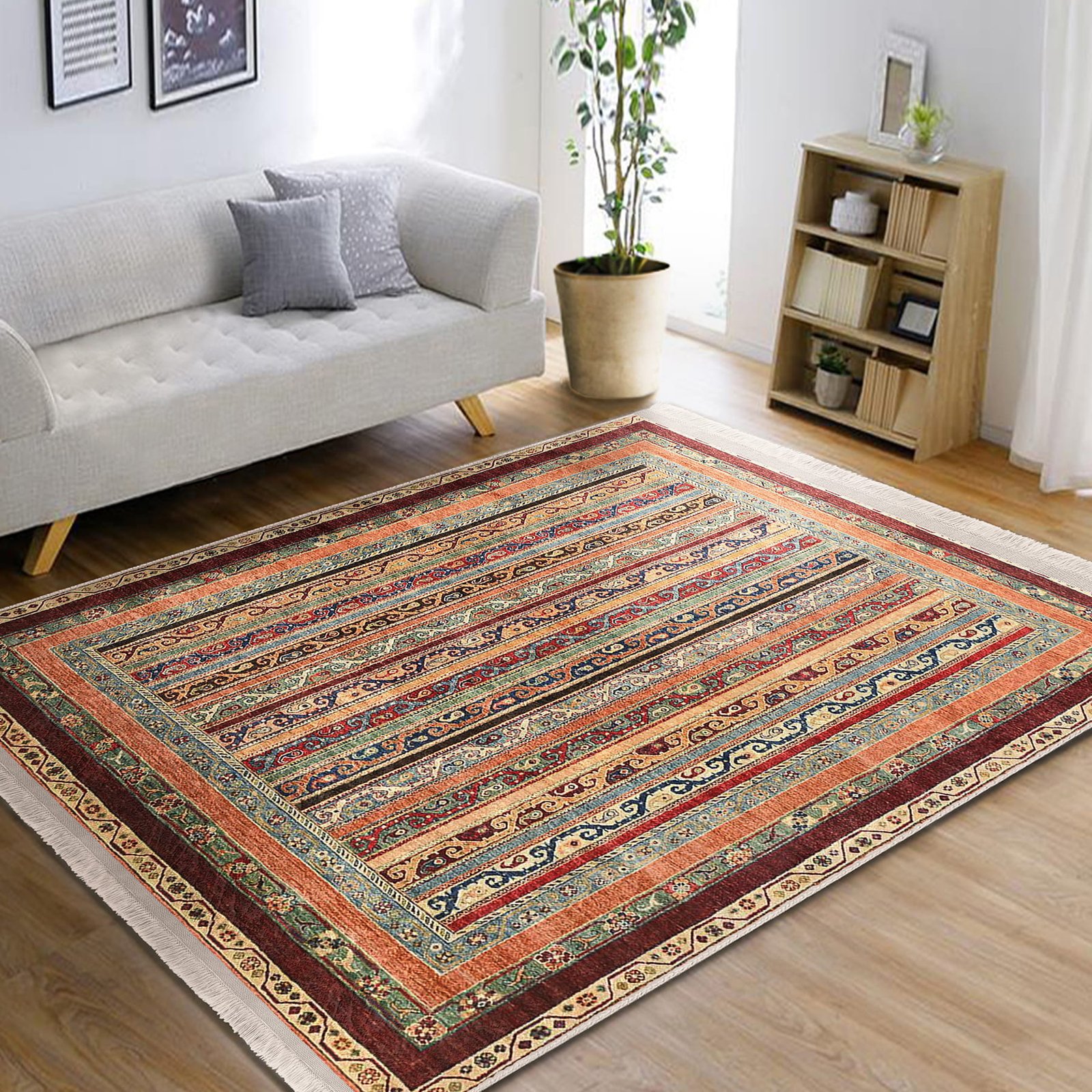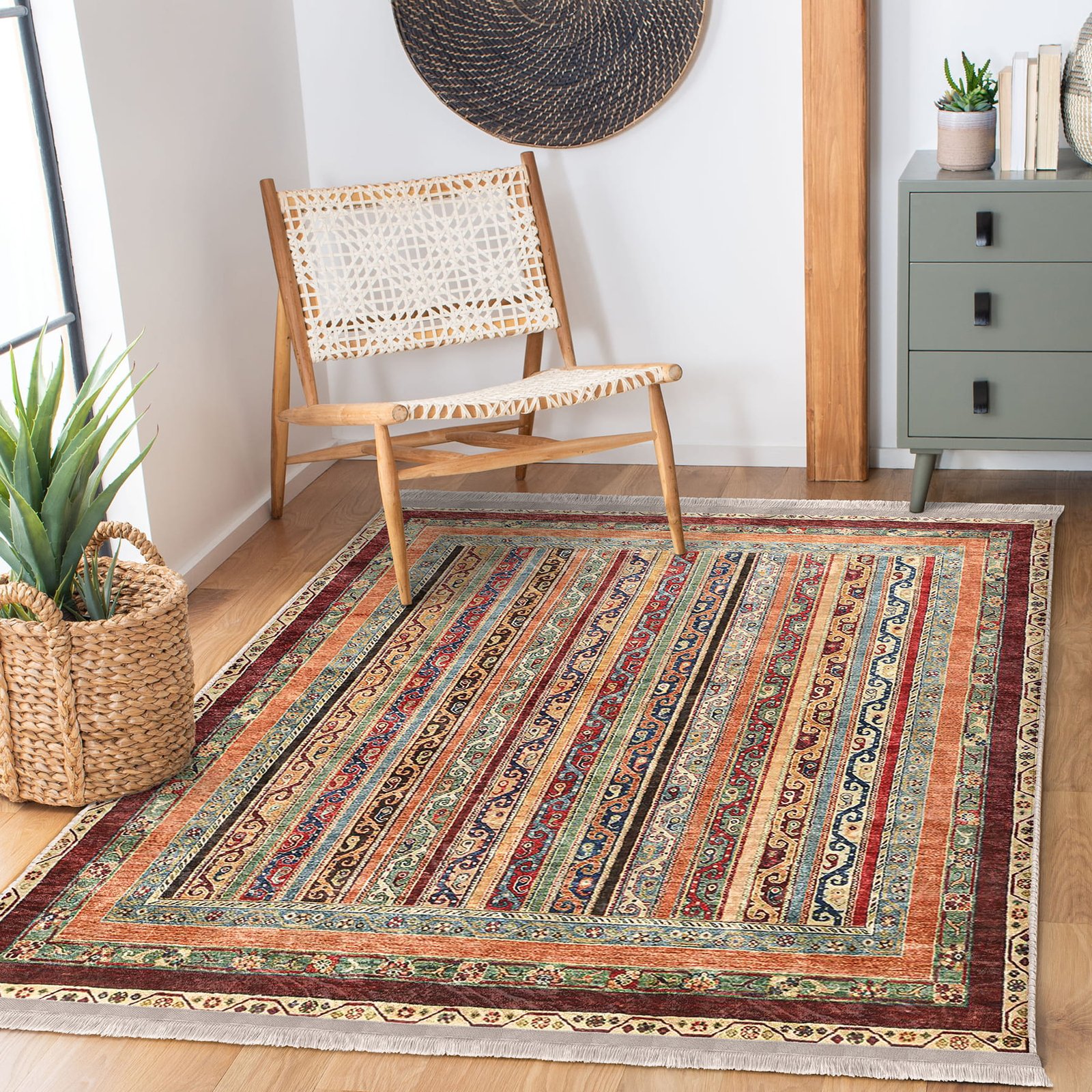 Bej Zeminde Kilim Motifli Geleneksel Desenli Avangarde Etnik Motifler Salon & Oturma Odası Koridor & Antre Dijital Baskılı Makinede Yıkanabilir Kaymaz Taban Saçaklı Halı