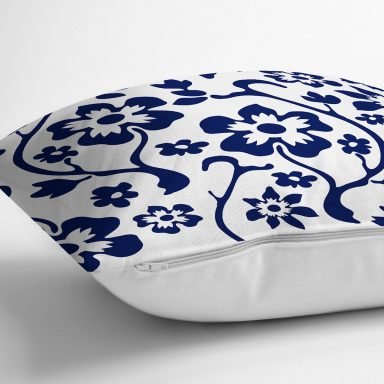 Beyaz Zemin Lacivert Gül Motifli Dekoratik Yastık Kırlent Kılıfı
