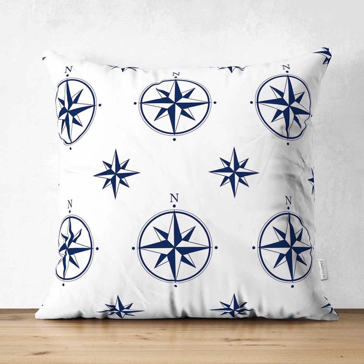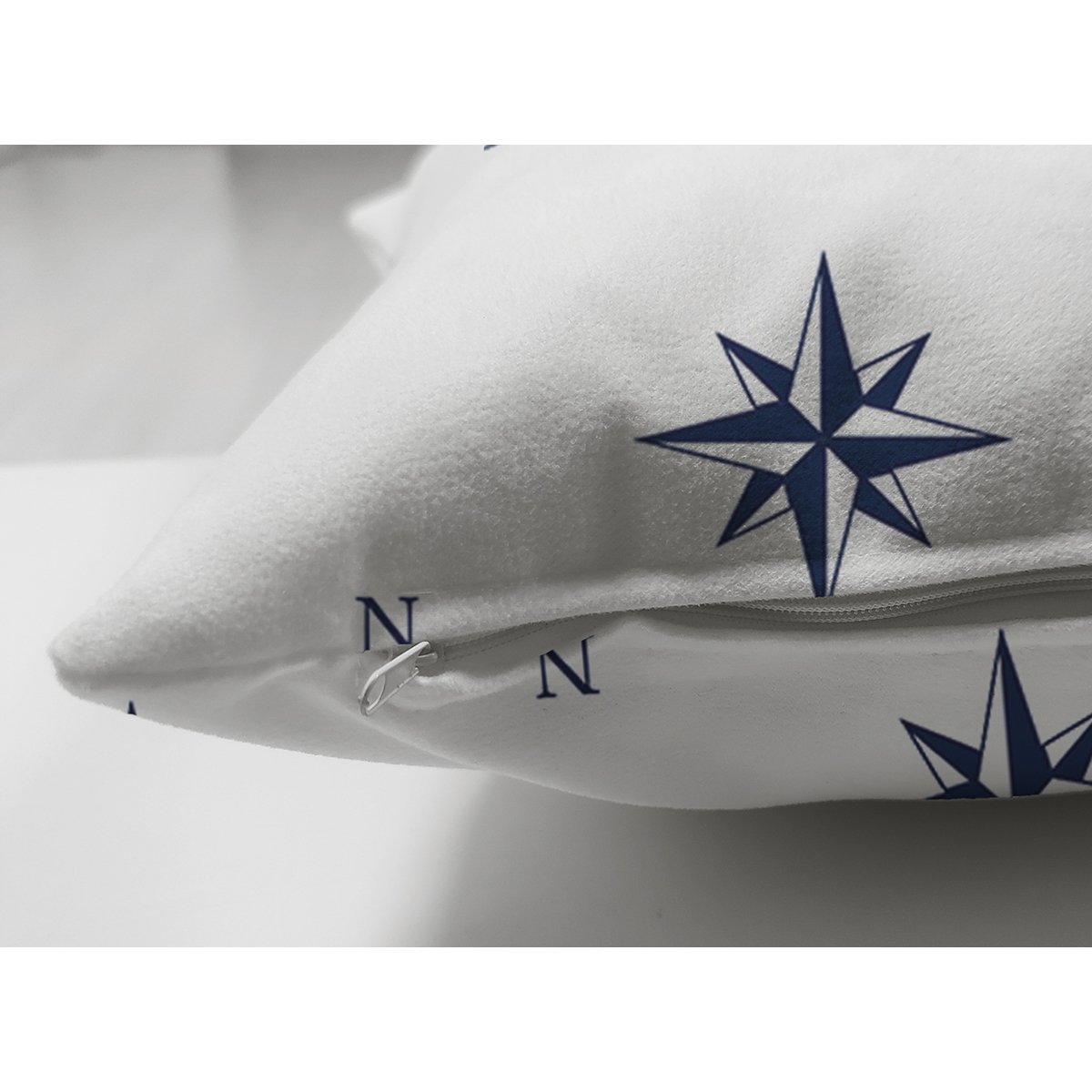 Beyaz Zemin Üzerinde Modern Pusula Desenli Dijital Baskılı Modern Süet Yastık Kırlent Kılıfı