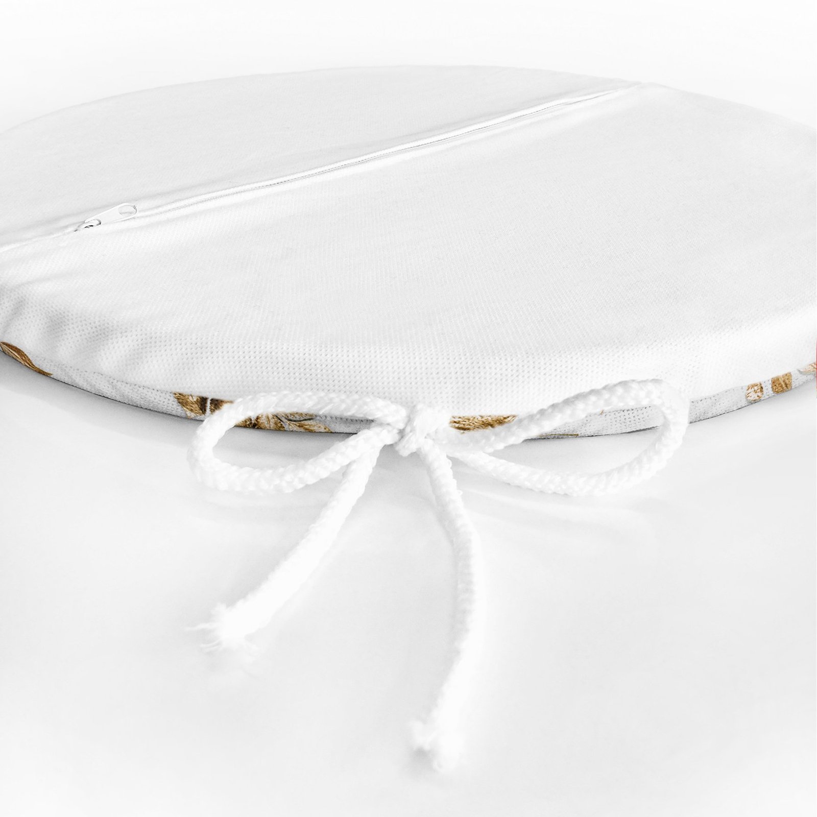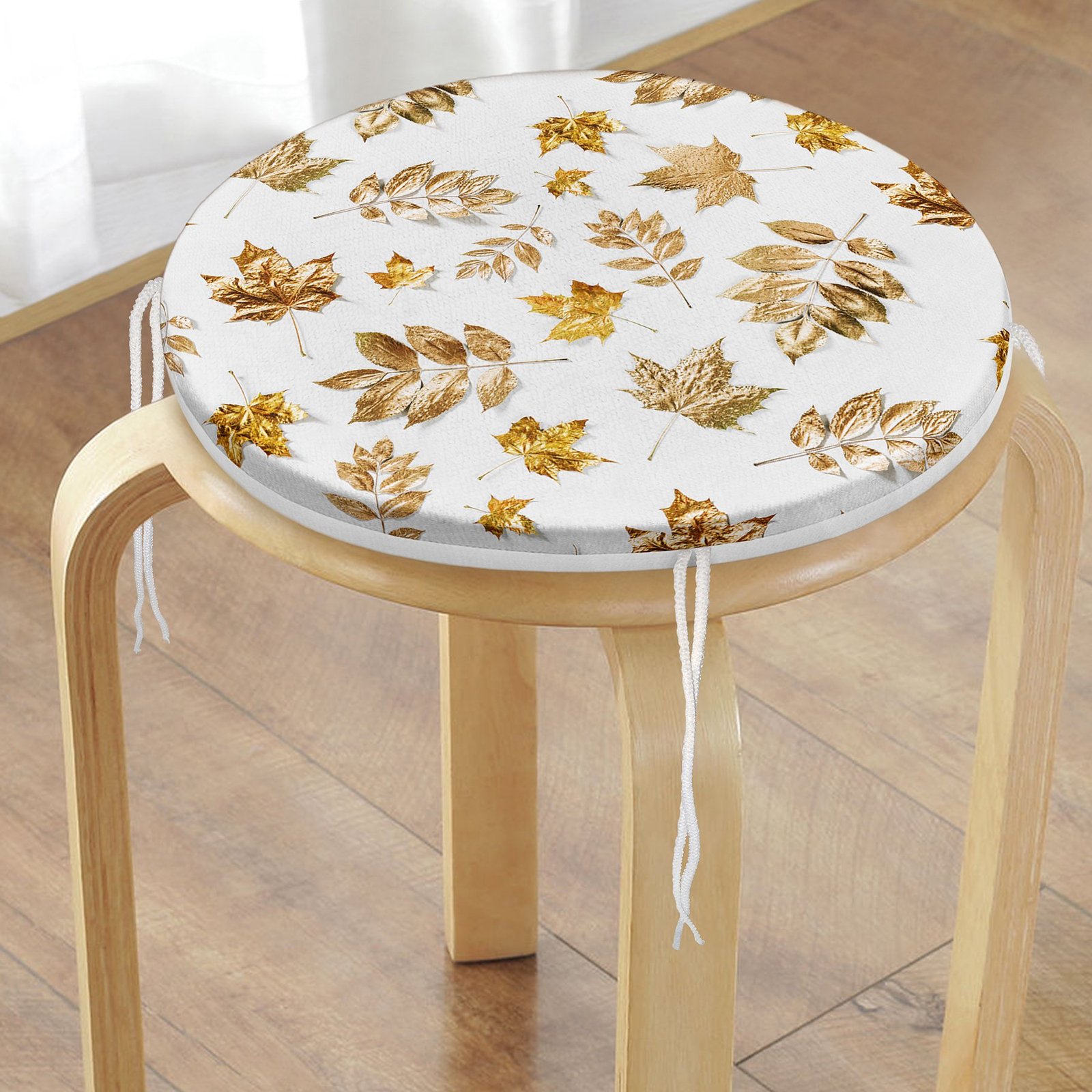 Beyaz Zeminde Altın Yapraklar Desenli Dijital Baskılı Yuvarlak Fermuarlı Sandalye Minderi