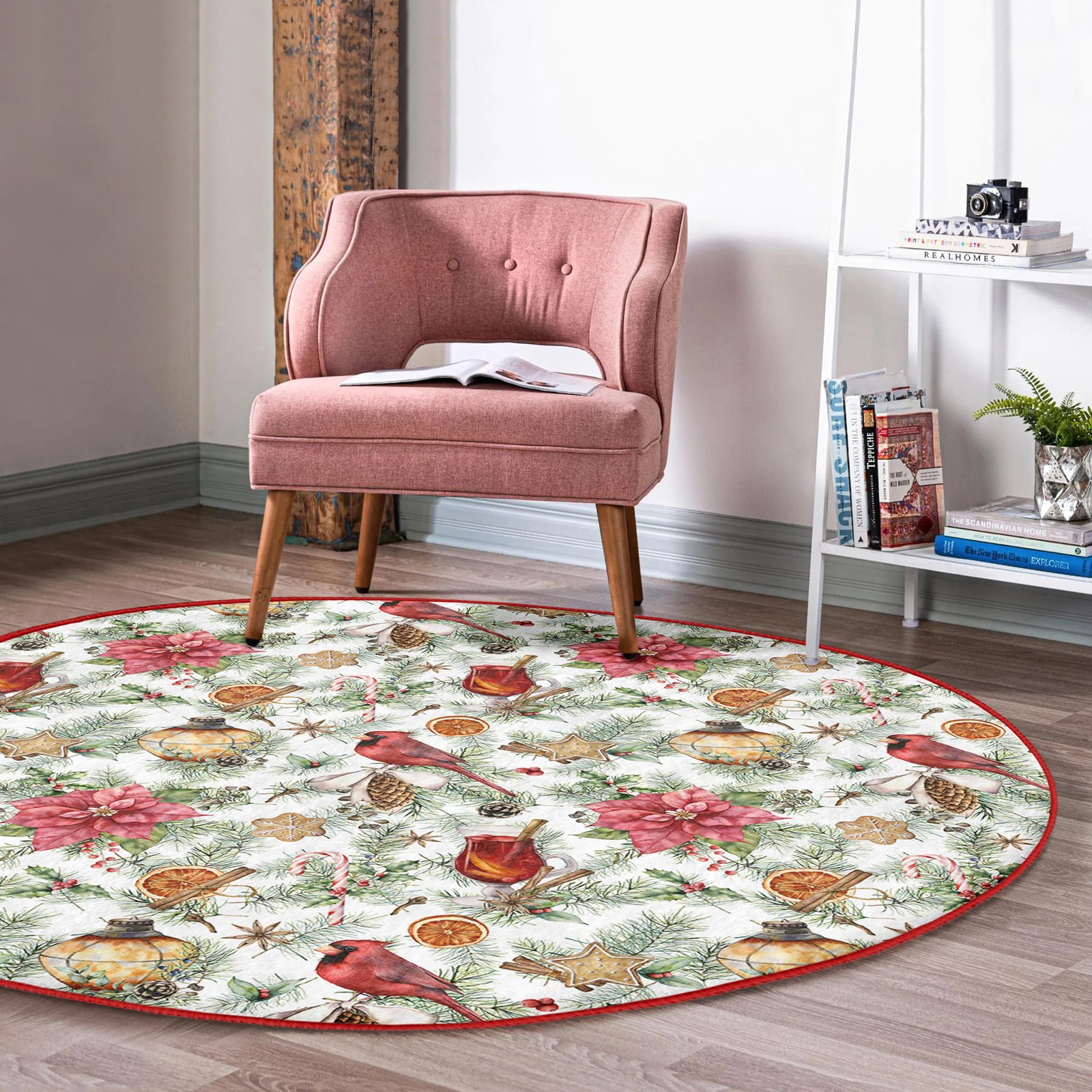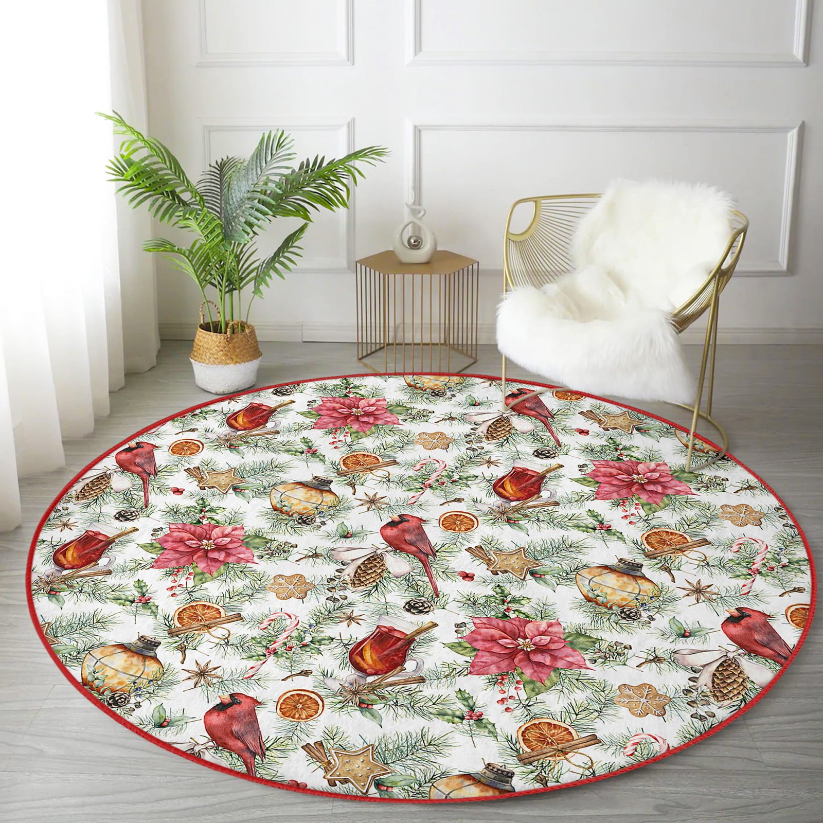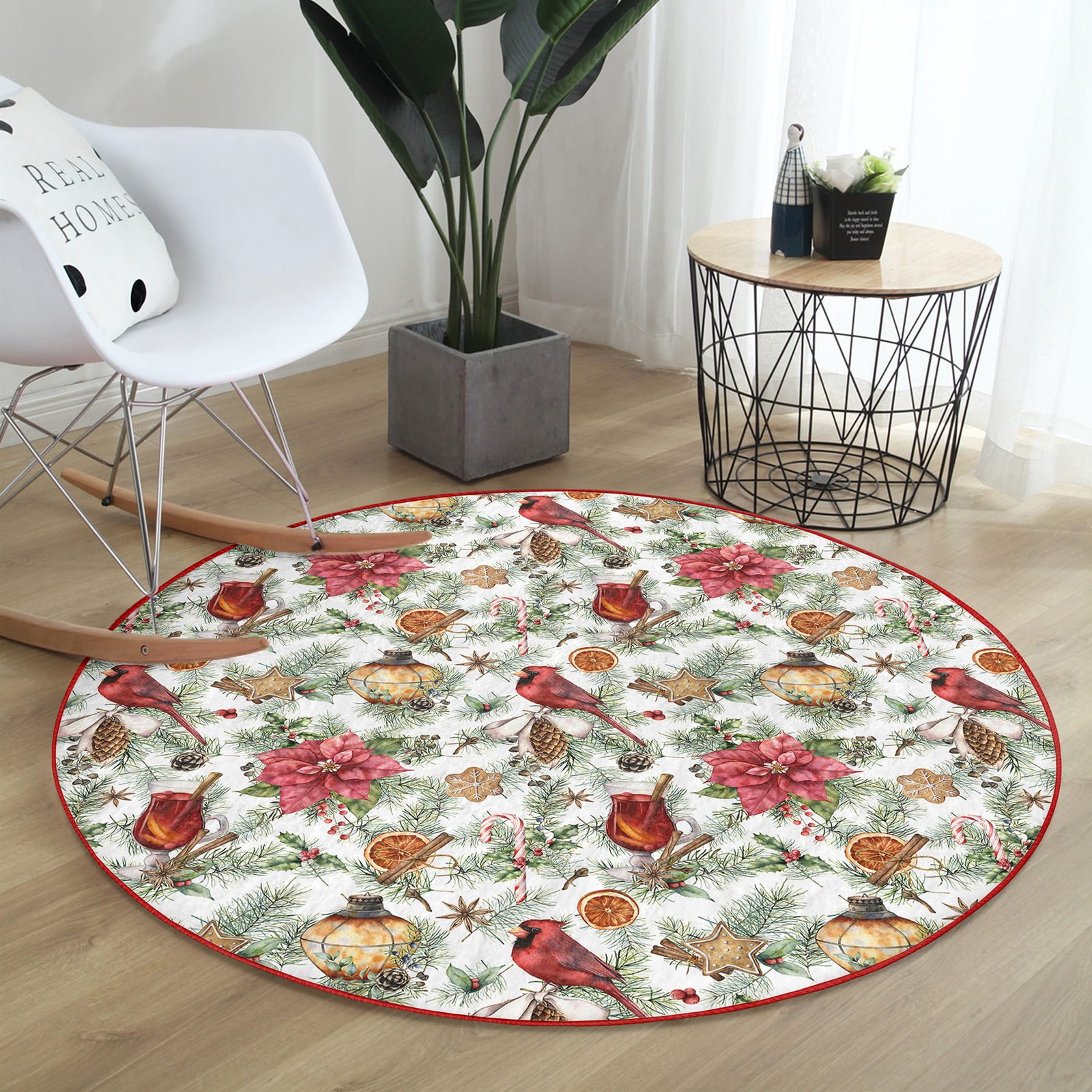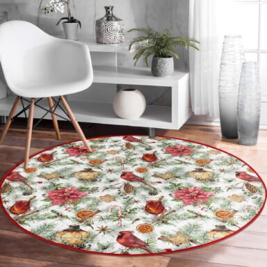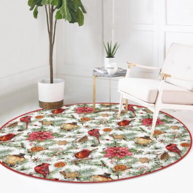 Beyaz Zeminde Çiçek Desenli Dijital Baskılı Bordo Outdoor Yıkanabilir Kaymaz Tabanlı Yuvarlak Halı
