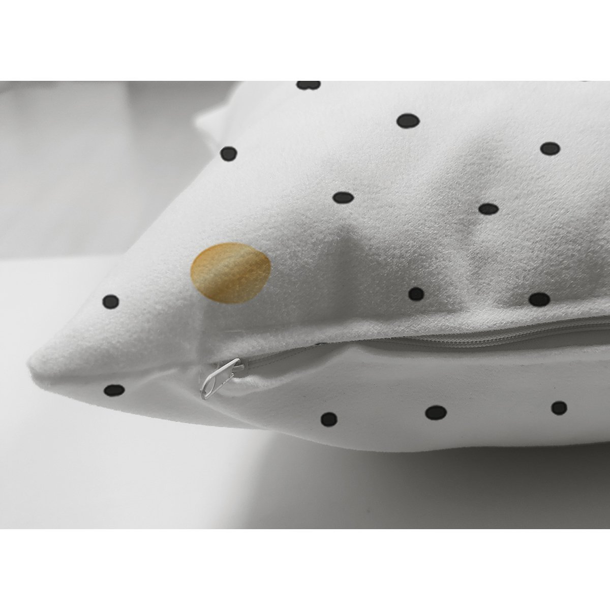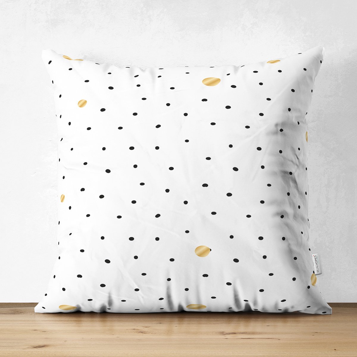 Beyaz Zeminde Gold Detaylı Siyah Puantiye Desenli Dijital Baskılı Modern Süet Yastık Kırlent Kılıfı