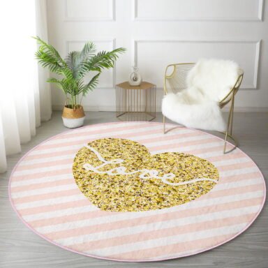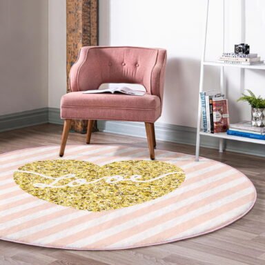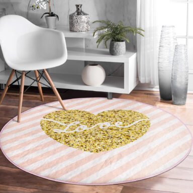 Beyaz Zeminde Gold Renkli Love Yazılı Modern Pembe Mutfak Yıkanabilir Kaymaz Tabanlı Yuvarlak Halı