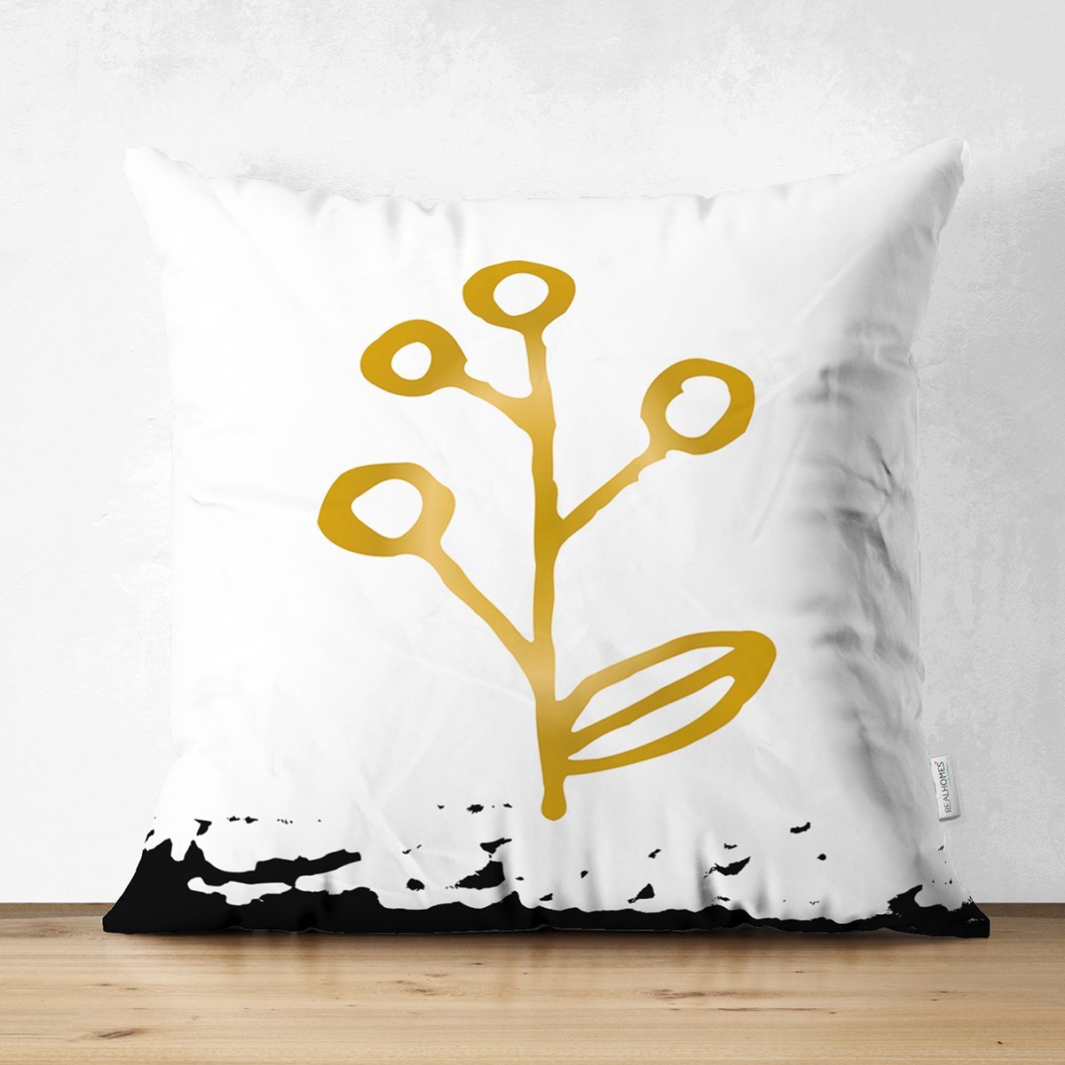 Beyaz Zeminde Gold Renkli Onedraw Çizimli Çiçek Desenli Dijital Baskılı Modern Süet Yastık Kırlent Kılıfı