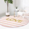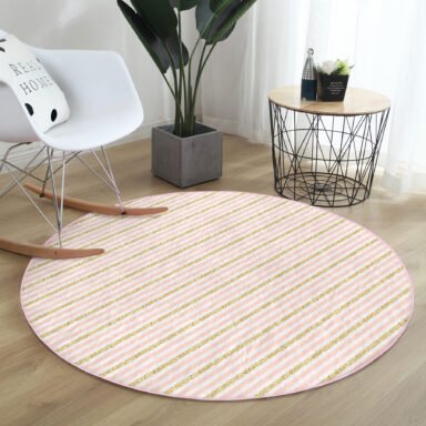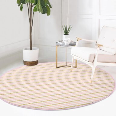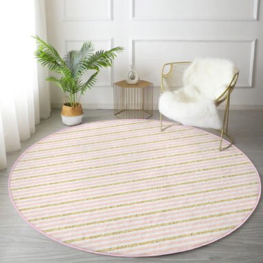 Beyaz Zeminde Pembe Yatay Çizgili Modern Yatak Odası Yıkanabilir Kaymaz Tabanlı Yuvarlak Halı