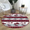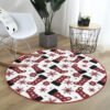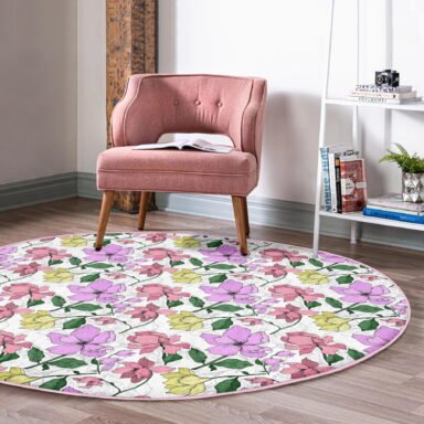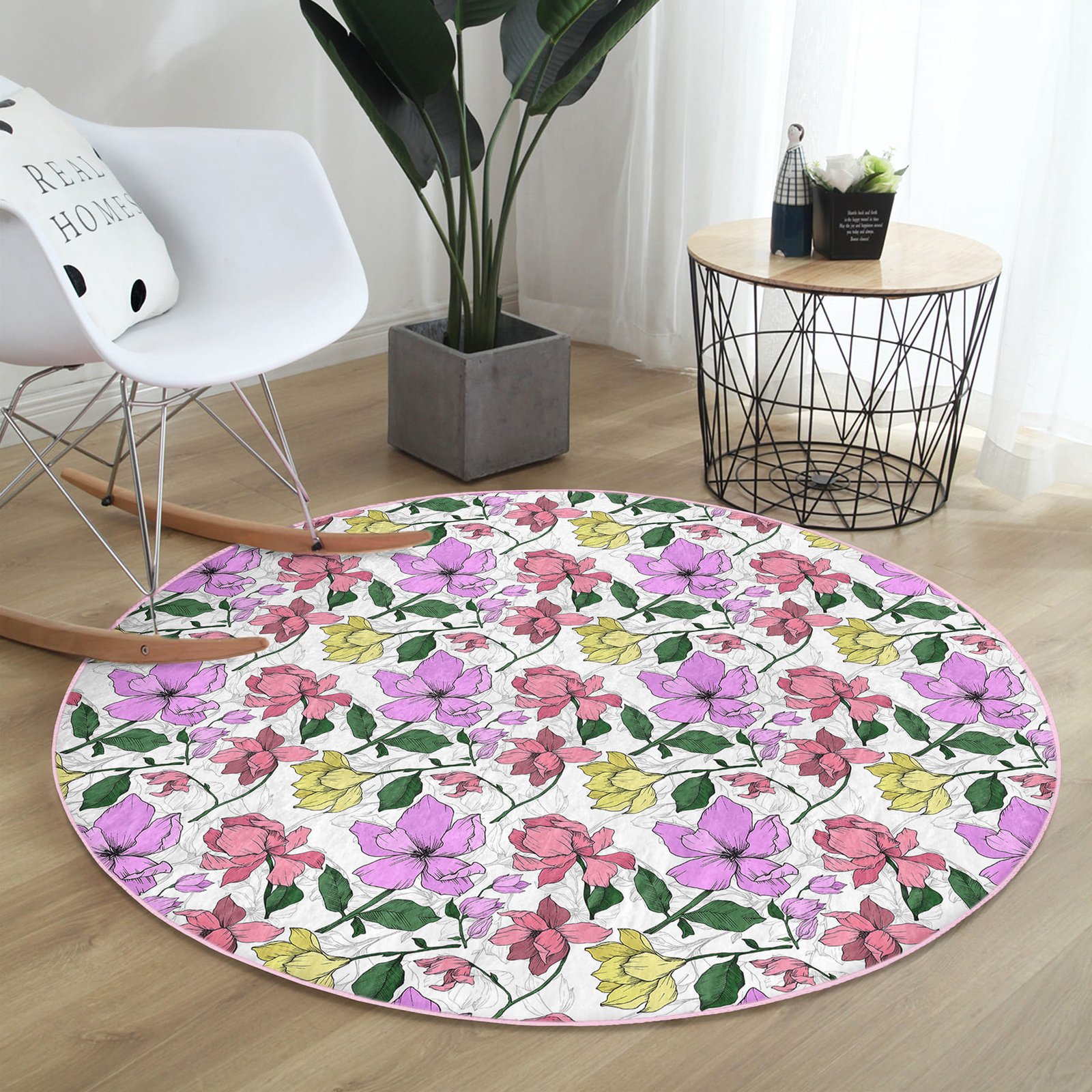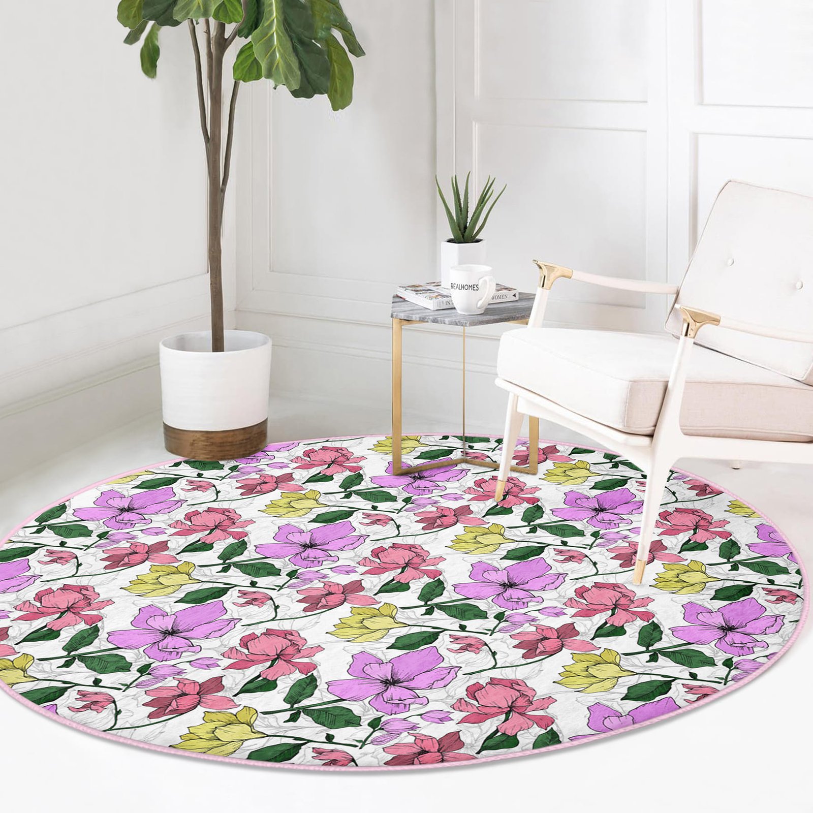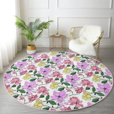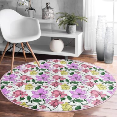 Beyaz Zeminde Renkli Çiçek Desenli Modern Pembe Yatak Odası Yıkanabilir Kaymaz Tabanlı Yuvarlak Halı
