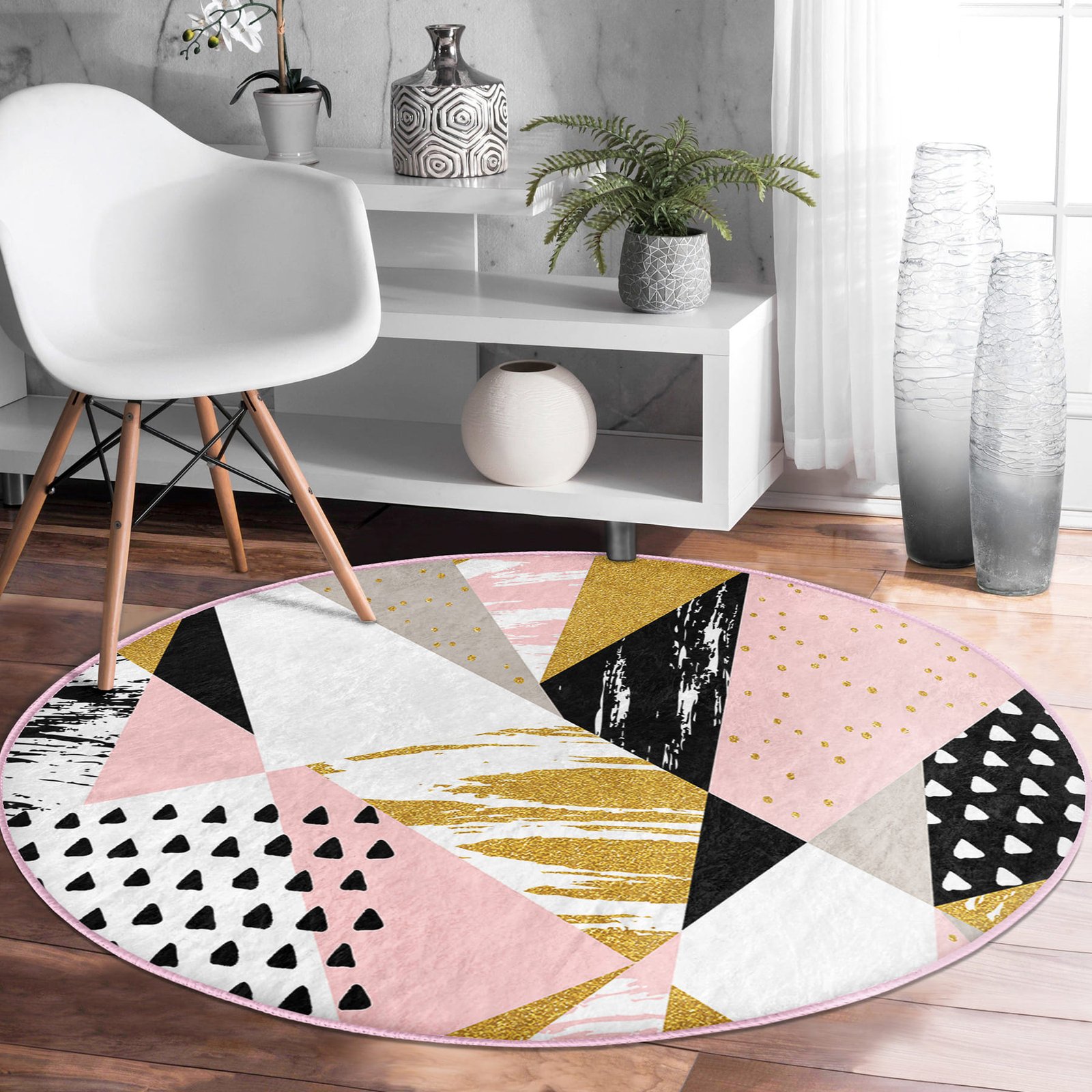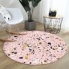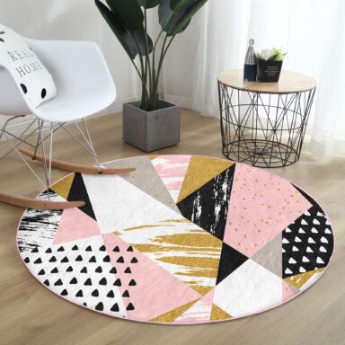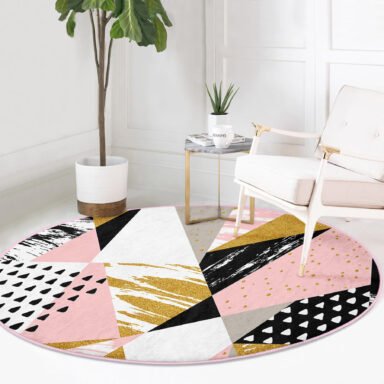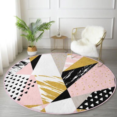 Beyaz Zeminde Renkli Geometrik Desenli Modern Pembe Mutfak Yıkanabilir Kaymaz Tabanlı Yuvarlak Halı