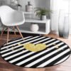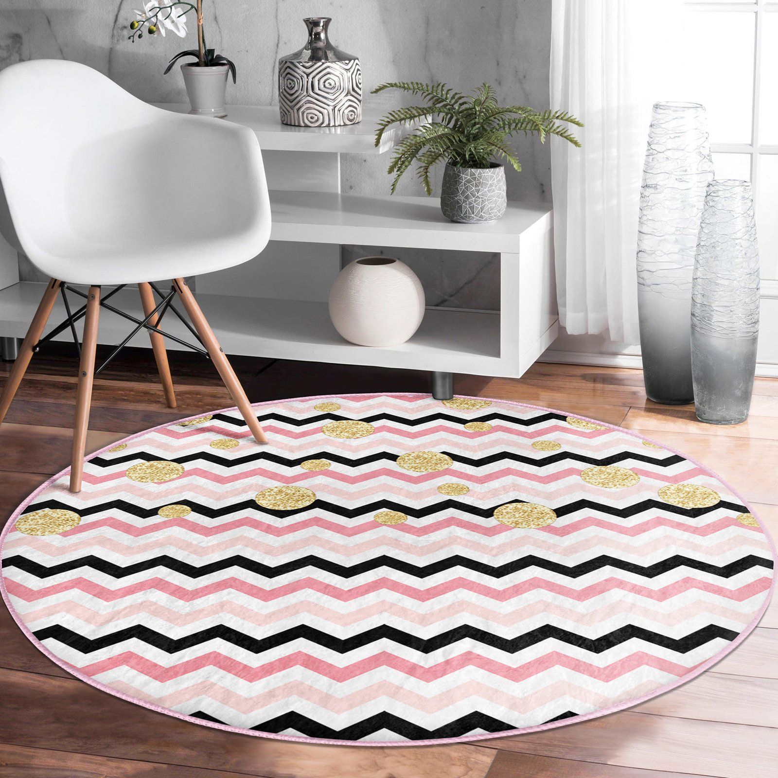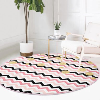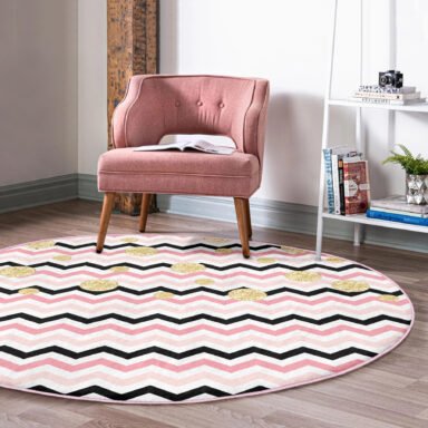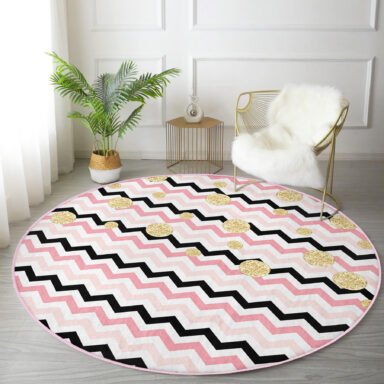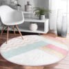 Beyaz Zeminde Renkli Geometrik Zikzak Desenli Pembe Banyo Yıkanabilir Kaymaz Tabanlı Yuvarlak Halı