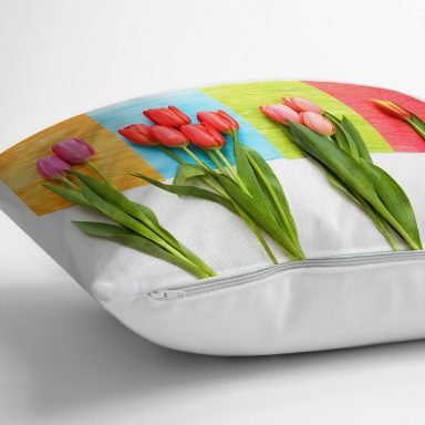 Beyaz Zeminde Renkli Laleler Özel Tasarımlı Yastık Kırlent Kılıfı