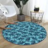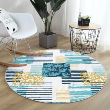 Beyaz Zeminde Renkli Modern Çizgili Yaprak Motifli Lacivert Outdoor Kaymaz Tabanlı Yuvarlak Halı