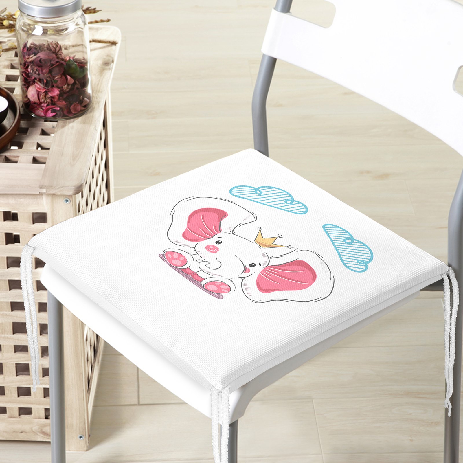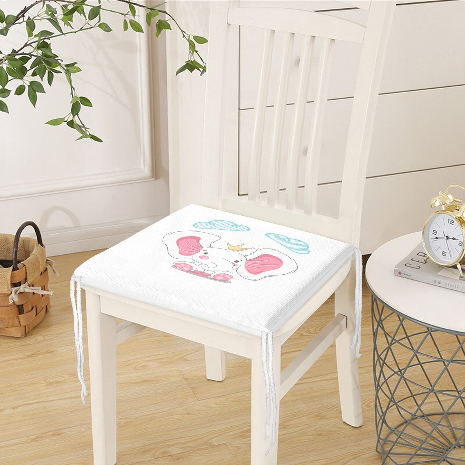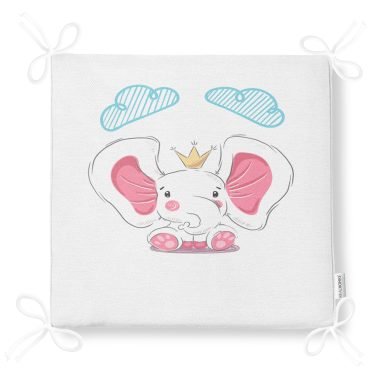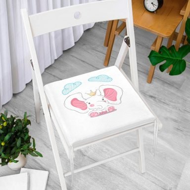 Beyaz Zeminde Sevimli Fil Tasarımlı Çocuk Odası Fermuarlı Sandalye Minderi